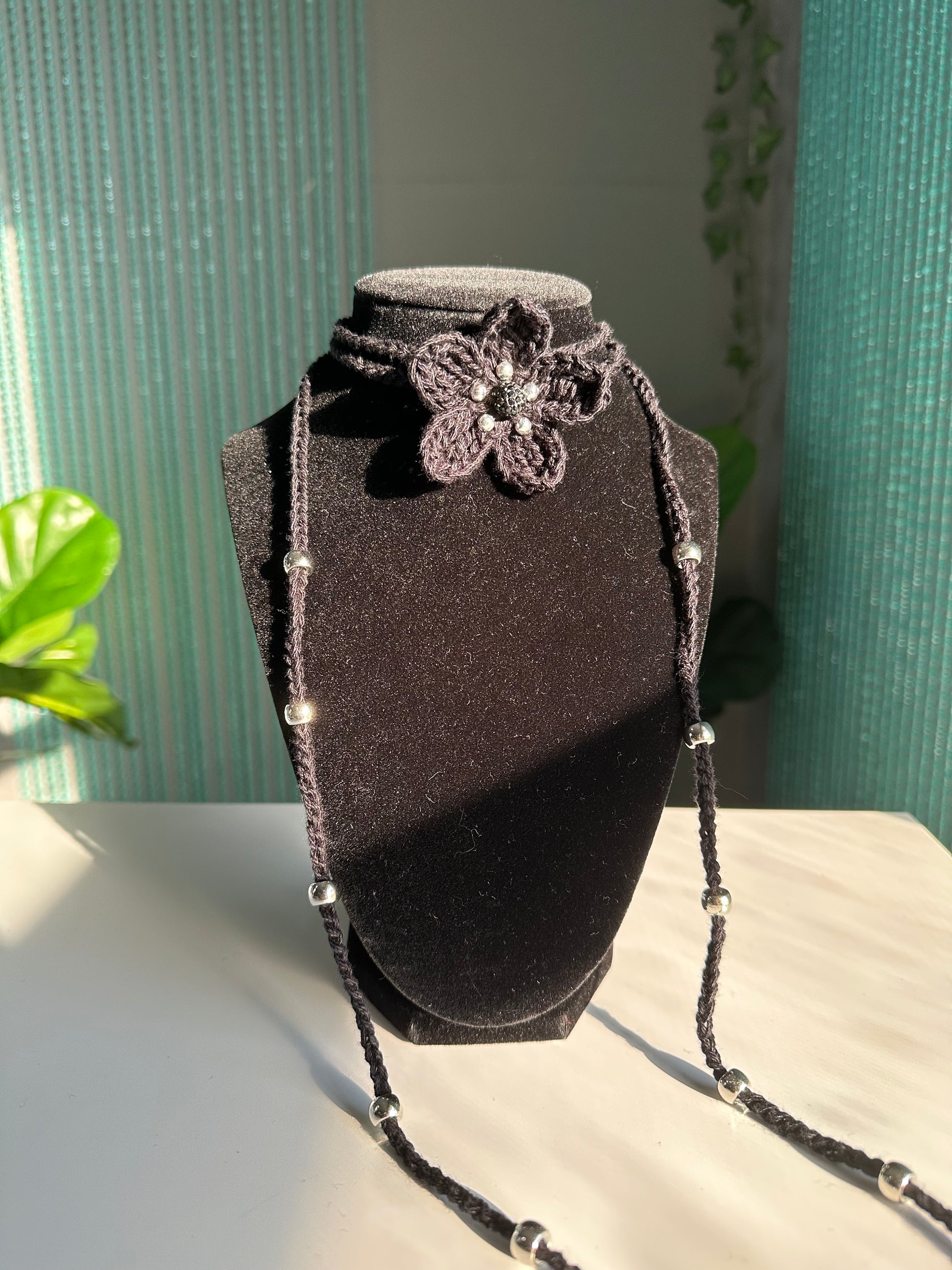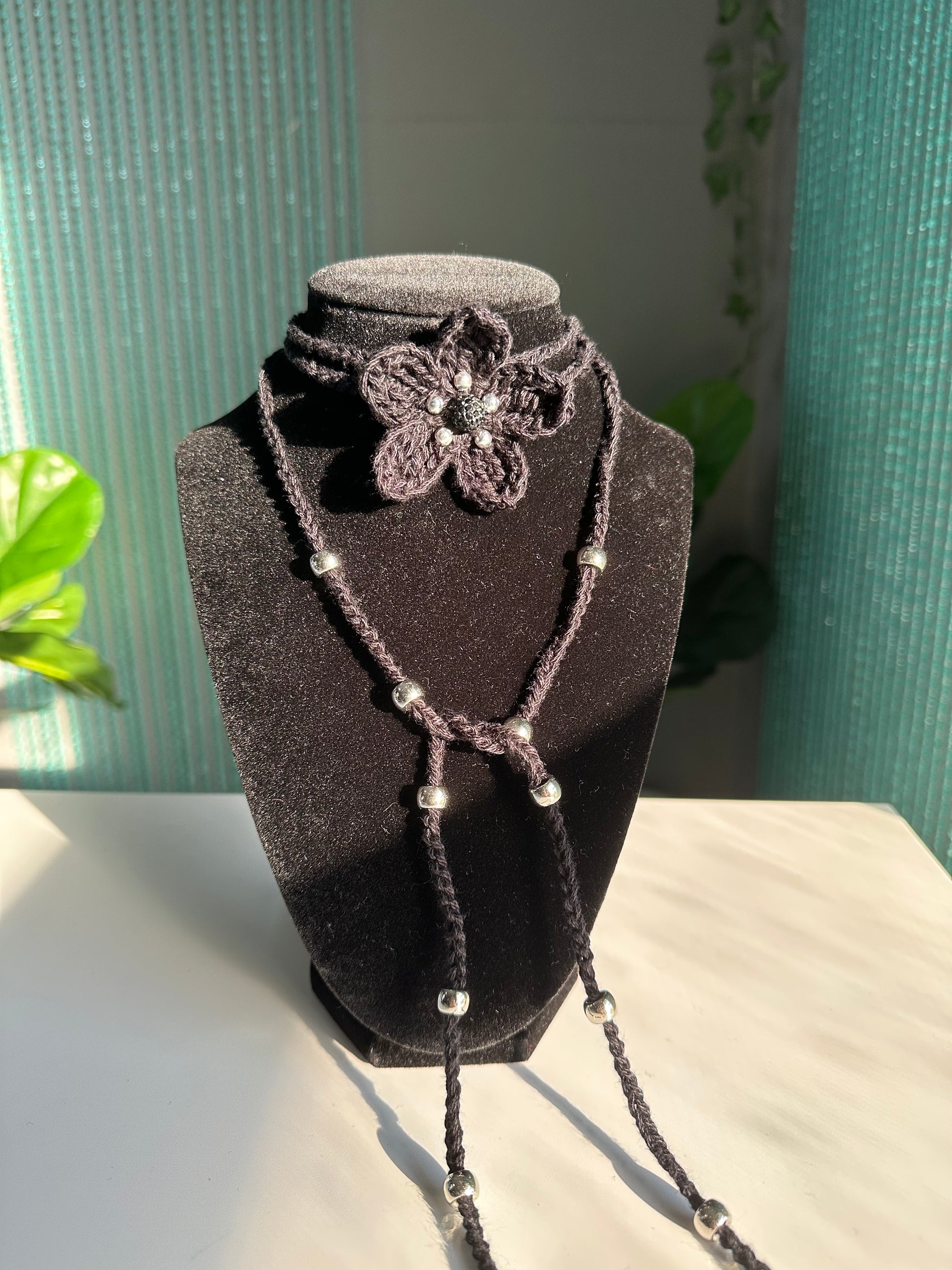 - The flower pendant measures 2.5in/6.3cm tall and wide. The strap measures 55in/140cm long.