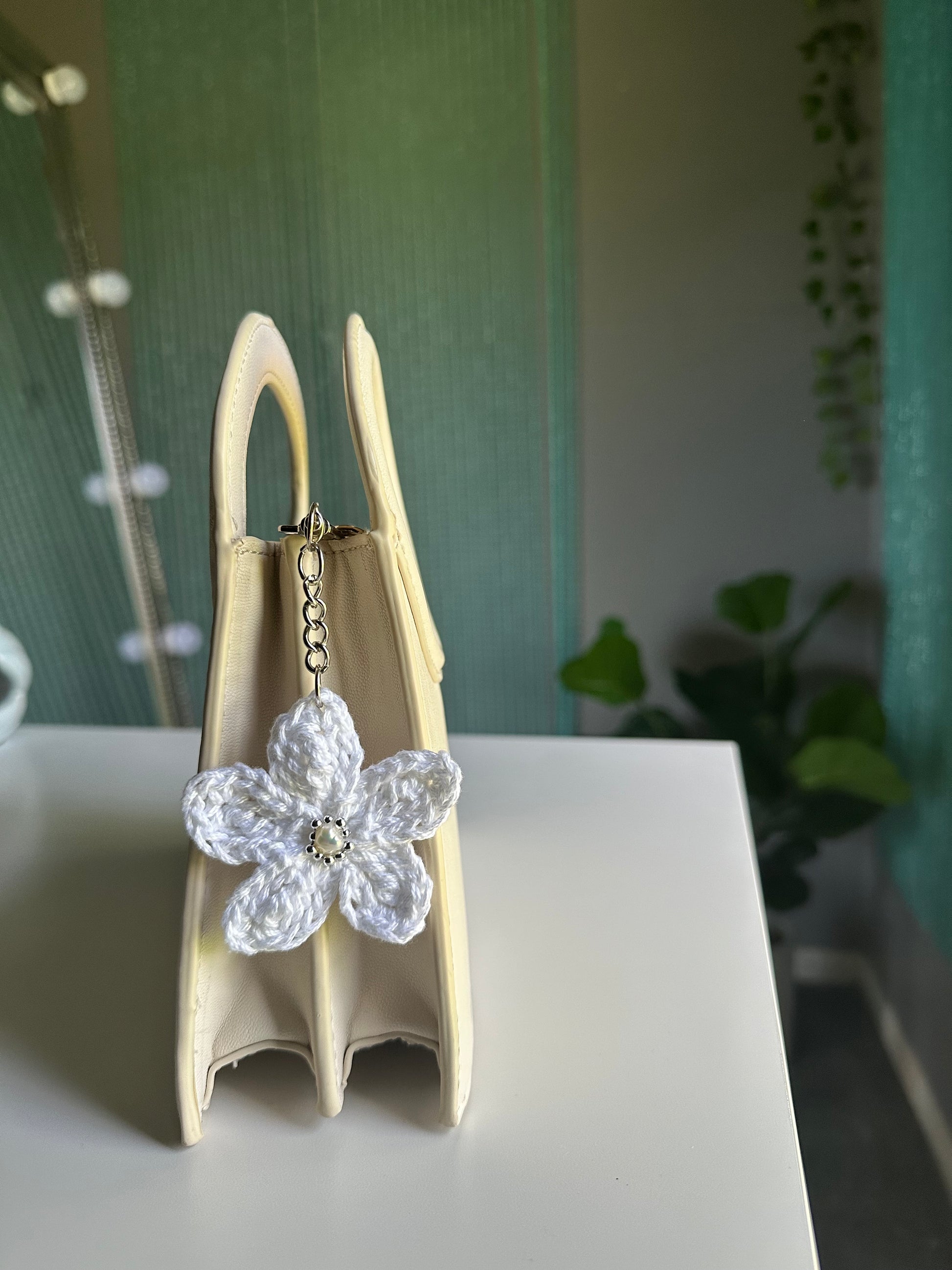 ❀ Handmade crocheted flower charm with pearl and silver beaded accents